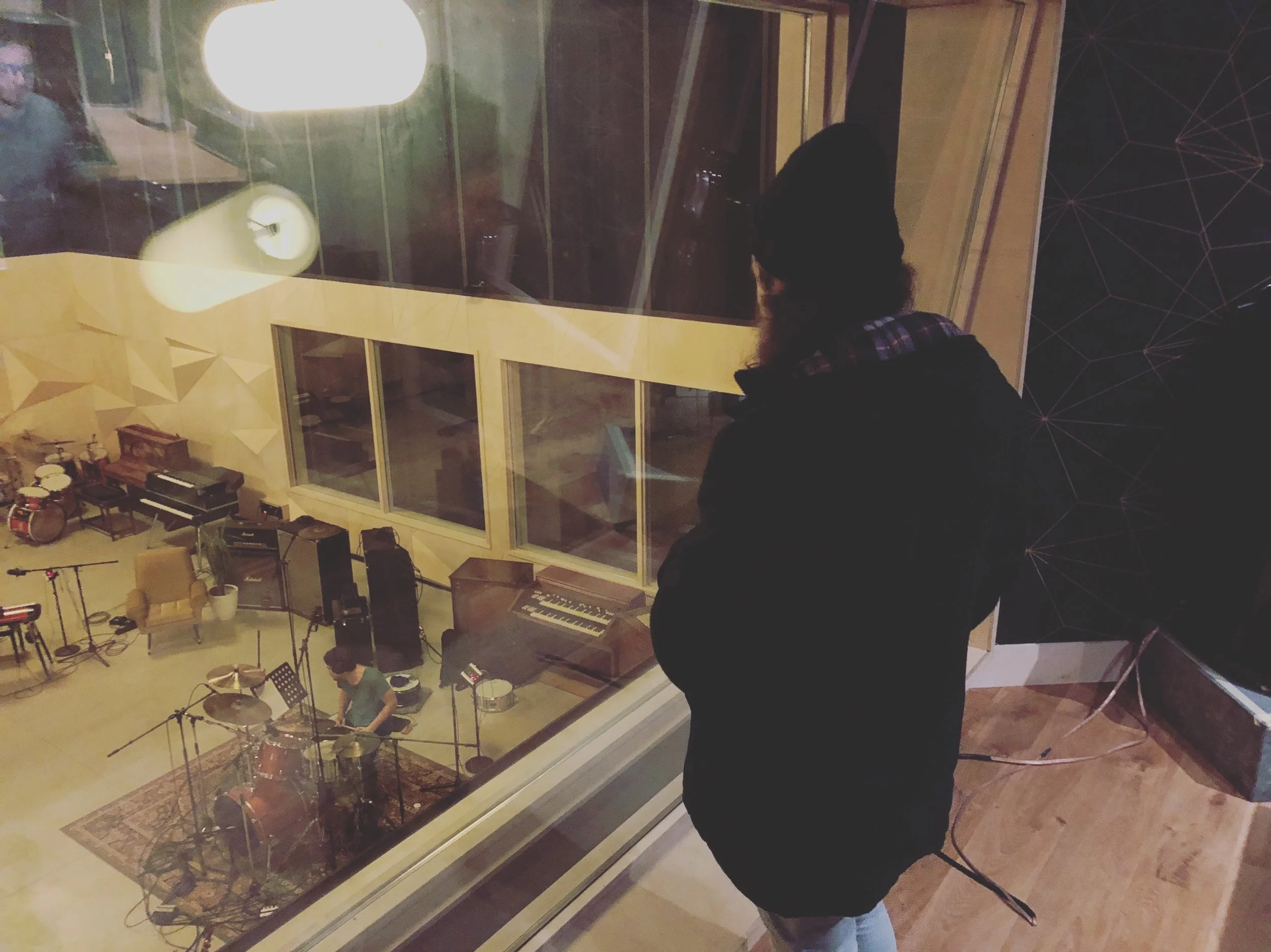 Working late tonight. After finishing one song with the band, Mich recorded drums with Jim for 4 new Blue Room songs.